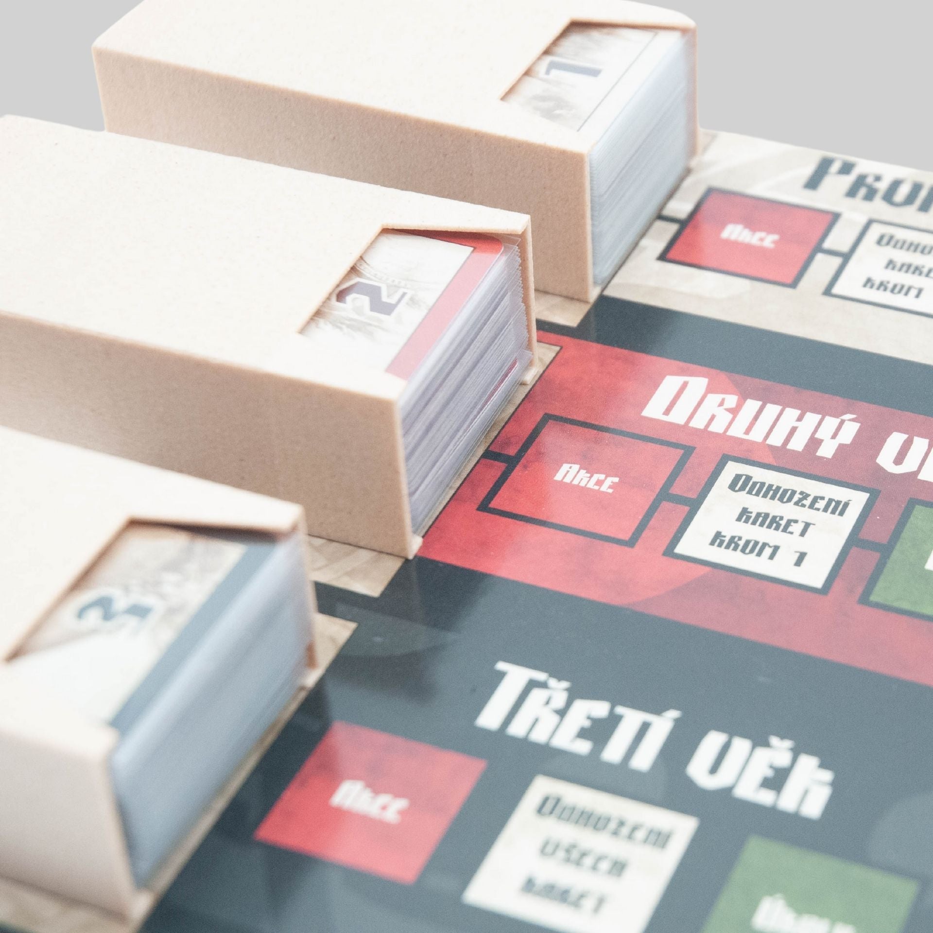 • The card boxes are designed to be used during play. This way the sleeved cards won't slide around and everything stays in one place. The card numbers are visible from the boxes so they can be easily identified and pulled out