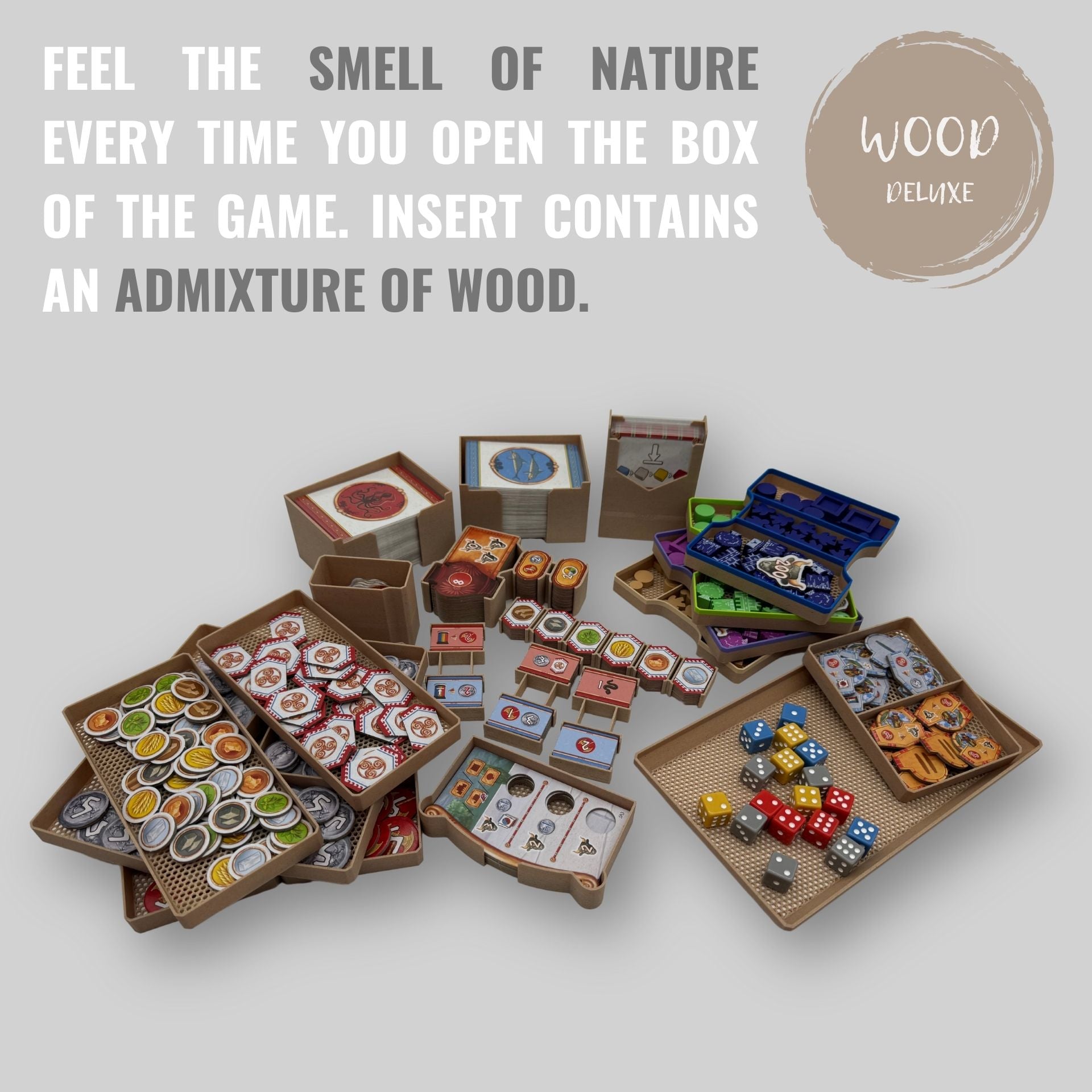 - Velká část komponent insertu lze využít i během hraní jako například miska na házení kostek, boxy na karty nebo organizéry pro žetony zboží či obchodních bonusů pro urychlení přípravy hry.